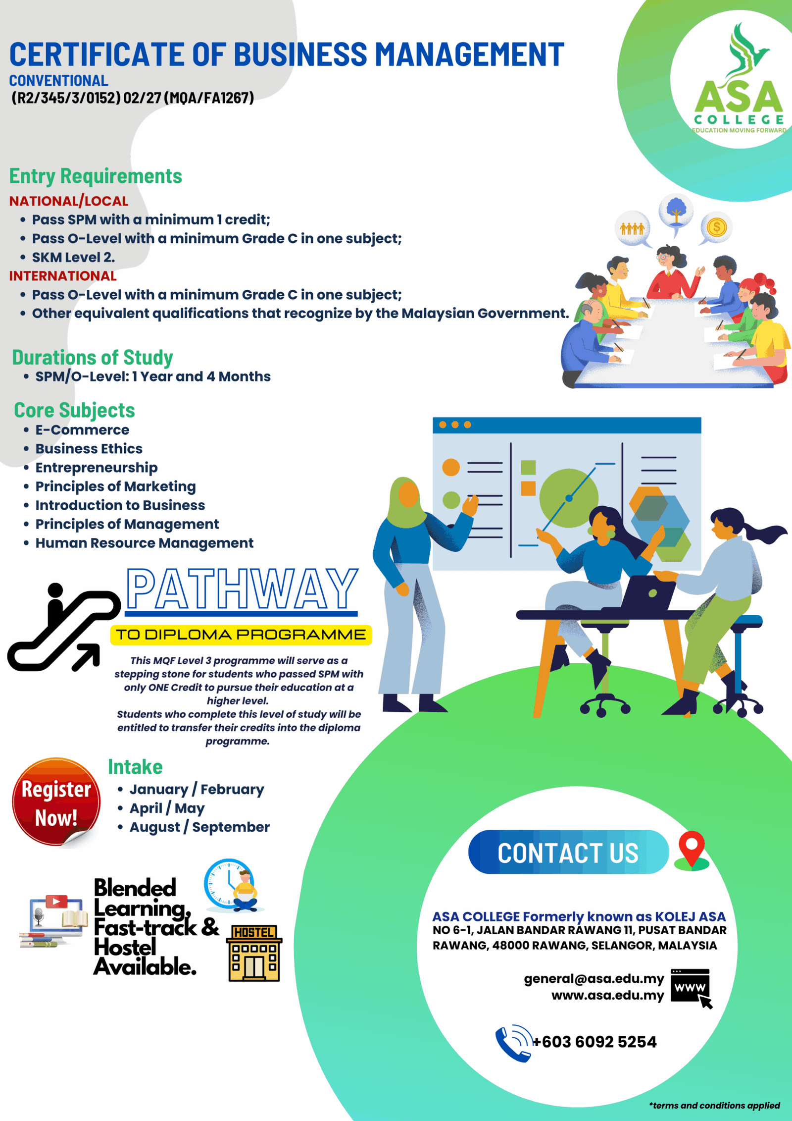 The Certificate of Business Management is designed to give students a solid foundation in essential business skills and knowledge. This programme serves as an ideal stepping stone for those who wish to pursue further studies, providing a smooth progression pathway into MQA-accredited Diploma programmes. It is open to both local and international students, offering a supportive and industry-relevant learning experience.